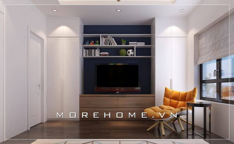 Kệ ti vi gỗ công nghiệp kiểu dáng hiện đại thiết kế âm tường đơn giản kết hợp kệ trang trí, kệ sách và tủ quần áo tiện nghi dành cho không gian phòng ngủ của bé trai